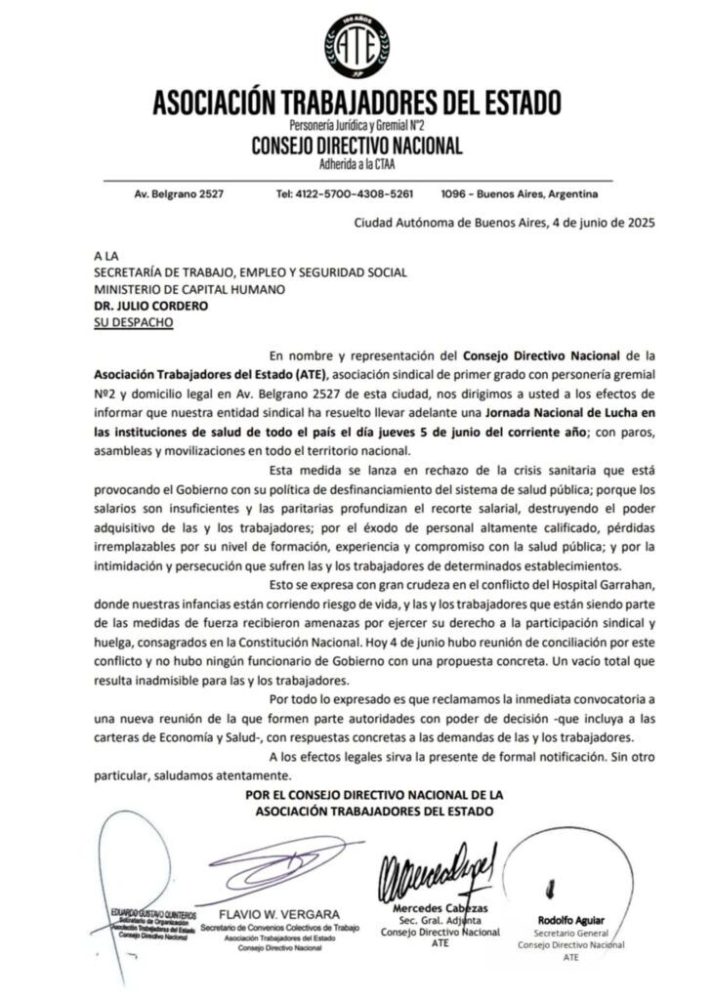 Luego del fracaso en la audiencia por el conflicto en el Hospital Garrahan, la Asociación Trabajadores del Estado (ATE) lanzó una Jornada Nacional de Protesta en Salud que comenzará a partir de las 00:00 de este jueves 5 de junio.