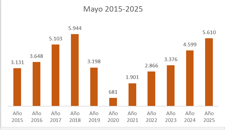 – Cantidad de actos: 5610, subió 22% respecto a mayo 2024 y aumentó 2,6% respecto del mes pasado