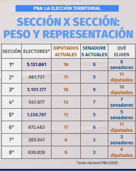 Con un peso total de 14.376.592 electores repartidos en 8 secciones del territorio bonaerense, más de un tercio del padrón nacional, esta elección será clave para proyectar resultados de las Generales del 26/10 en Argentina.