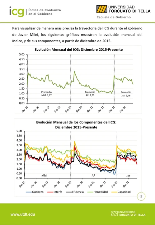 La confianza promedio en los 21 meses de Milei se ubica en 2,46 puntos, por debajo de Mauricio Macri en el mismo período (2,60) y por encima de Alberto Fernández (2,14).