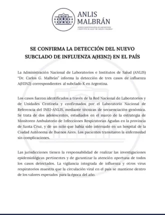 ANLIS-Malbrán confirmó la detección de un nuevo subclado de influenza A (H3N2) en Argentina