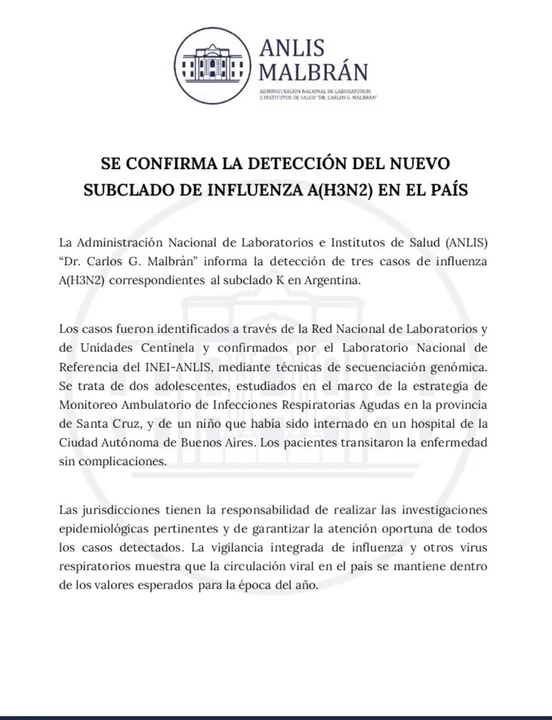 Buenos Aires, 19 diciembre (NA) – La Administración Nacional de Laboratorios e Institutos de Salud (ANLIS) “Dr. Carlos G. Malbrán” confirmó la detección de tres casos de influenza A (H3N2) correspondientes al subclado K en el país, identificados mediante técnicas de secuenciación genómica, según supo la Agencia Noticias Argentinas.