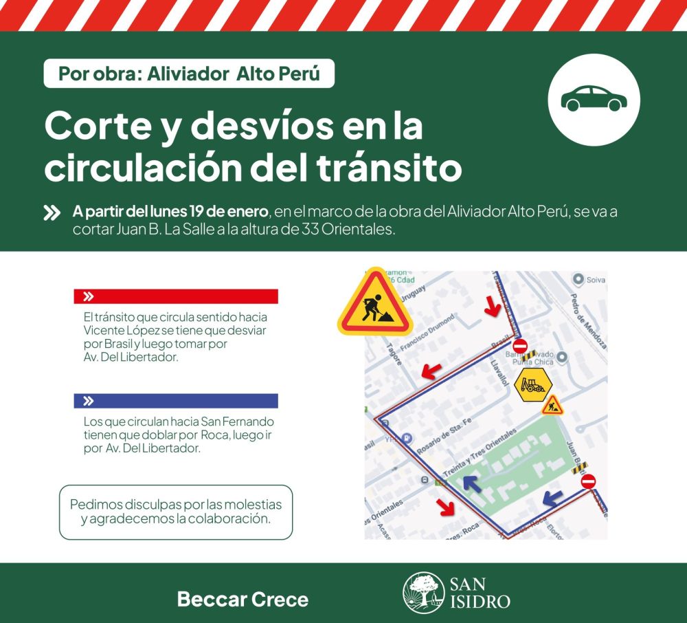 Para el tránsito que circula hacia Vicente López el desvío será La Salle, Brasil y av. Del Libertador; mientras que los vehículos que circulen hacia San Fernando, deberán realizar el recorrido: La Salle, Roca y av. Del Libertador.