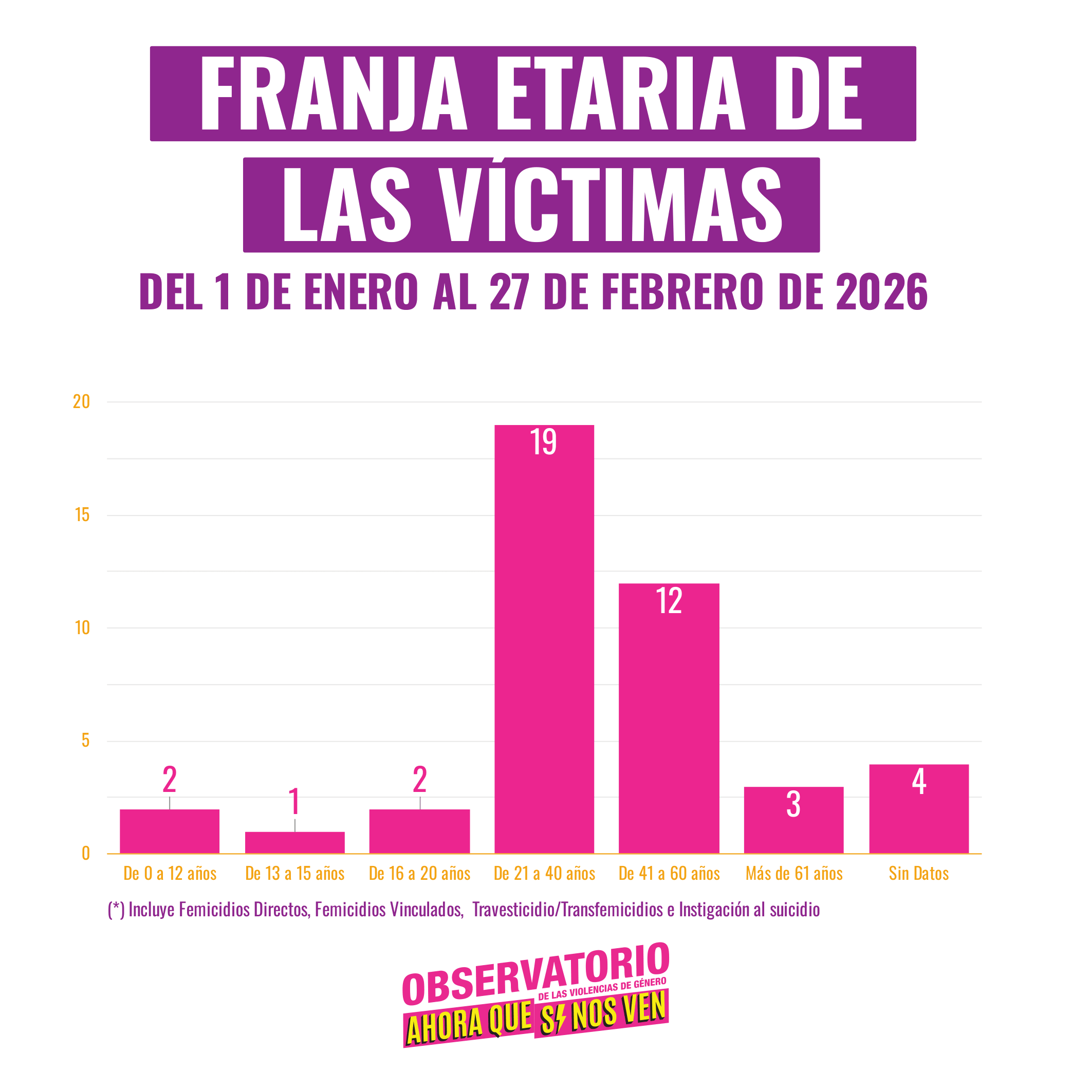 Entre el 1 de enero y el 27 de febrero relevamos 43 víctimas fatales: 35 femicidios directos, 5 femicidios vinculados, 2 instigaciones al suicidio y 1 travesticidio/transfemicidio.