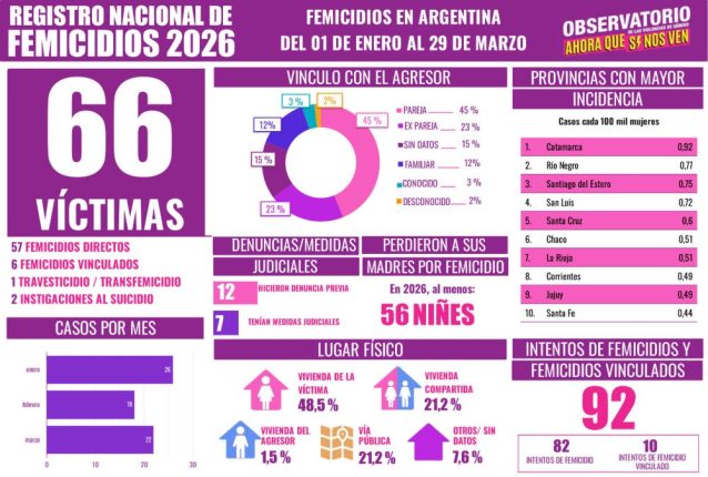 Entre el 1 de enero y el 29 de marzo de este año relevamos, a partir del análisis de medios de comunicación: 66 víctimas fatales: 57 femicidios directos, 6 femicidios vinculados, 2 instigaciones al suicidio y 1 travesticidio/transfemicidio. Datos alarmantes: * 1 femicidio cada 33 hs en lo que va del año* 22 casos en marzo * […]